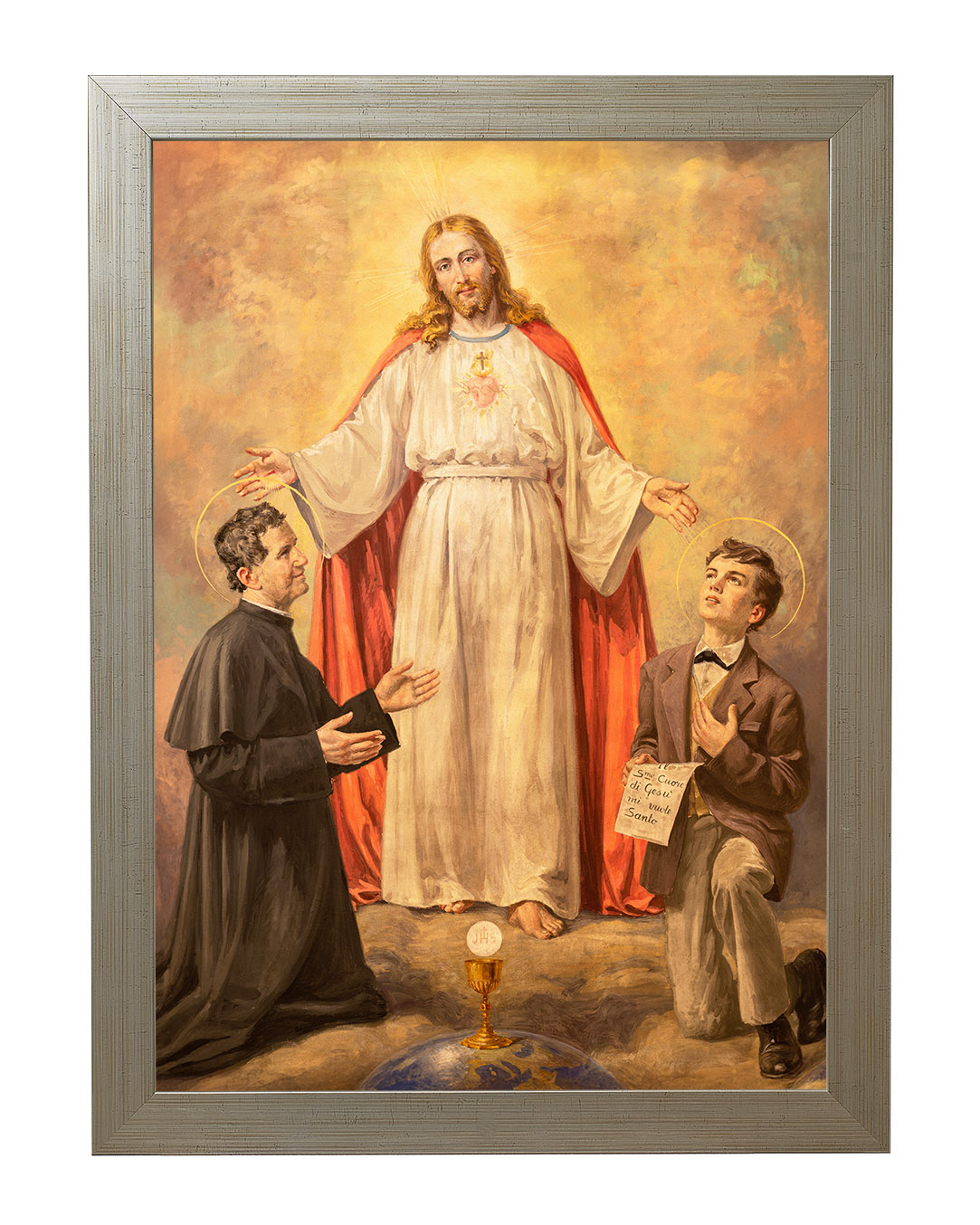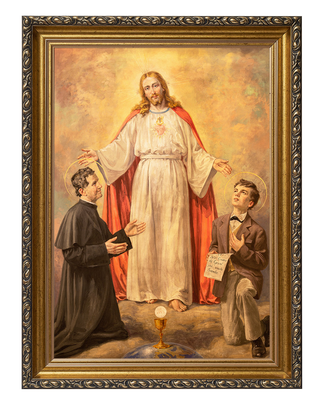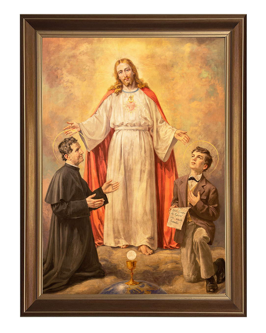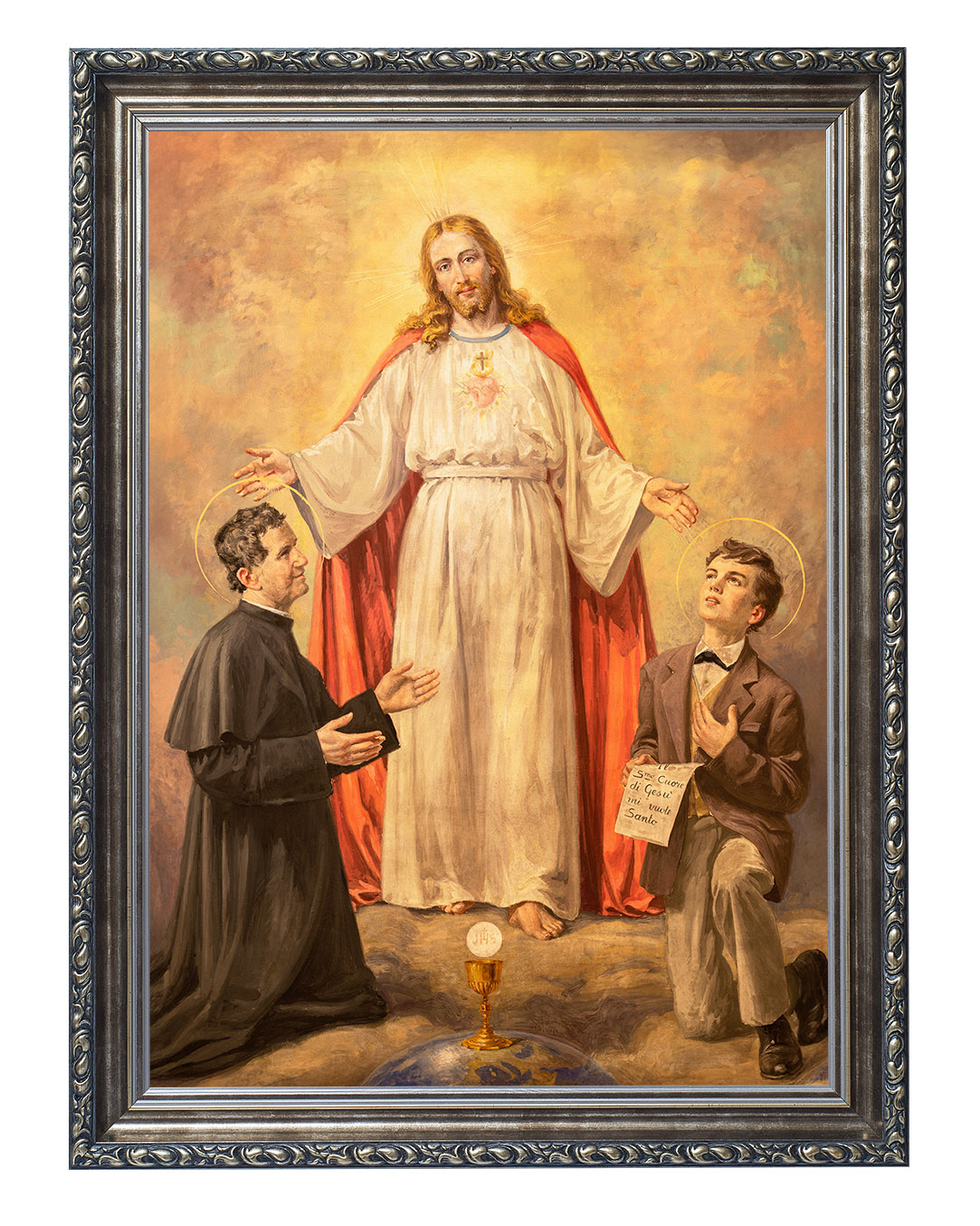 Ten wyjątkowy obraz ukazuje świętego Jana Bosko i jego duchowego syna, świętego Dominika Savio, w mistycznej wizji Chrystusa. Centralną postacią dzieła jest Jezus Chrystus, ubrany w białą szatę z czerwonym płaszczem, symbolizującym Jego miłość i poświęcenie. Jego rozpostarte ramiona zdają się obejmować i błogosławić dwóch klęczących świętych.Po lewej stronie znajduje się św. Jan Bosko, włoski kapłan i założyciel Zgromadzenia Salezjanów, znany ze swojej pracy wychowawczej wśród młodzieży. Jego pełne oddania spojrzenie oraz gest skierowany w stronę Chrystusa wyrażają pokorę i głęboką wiarę.