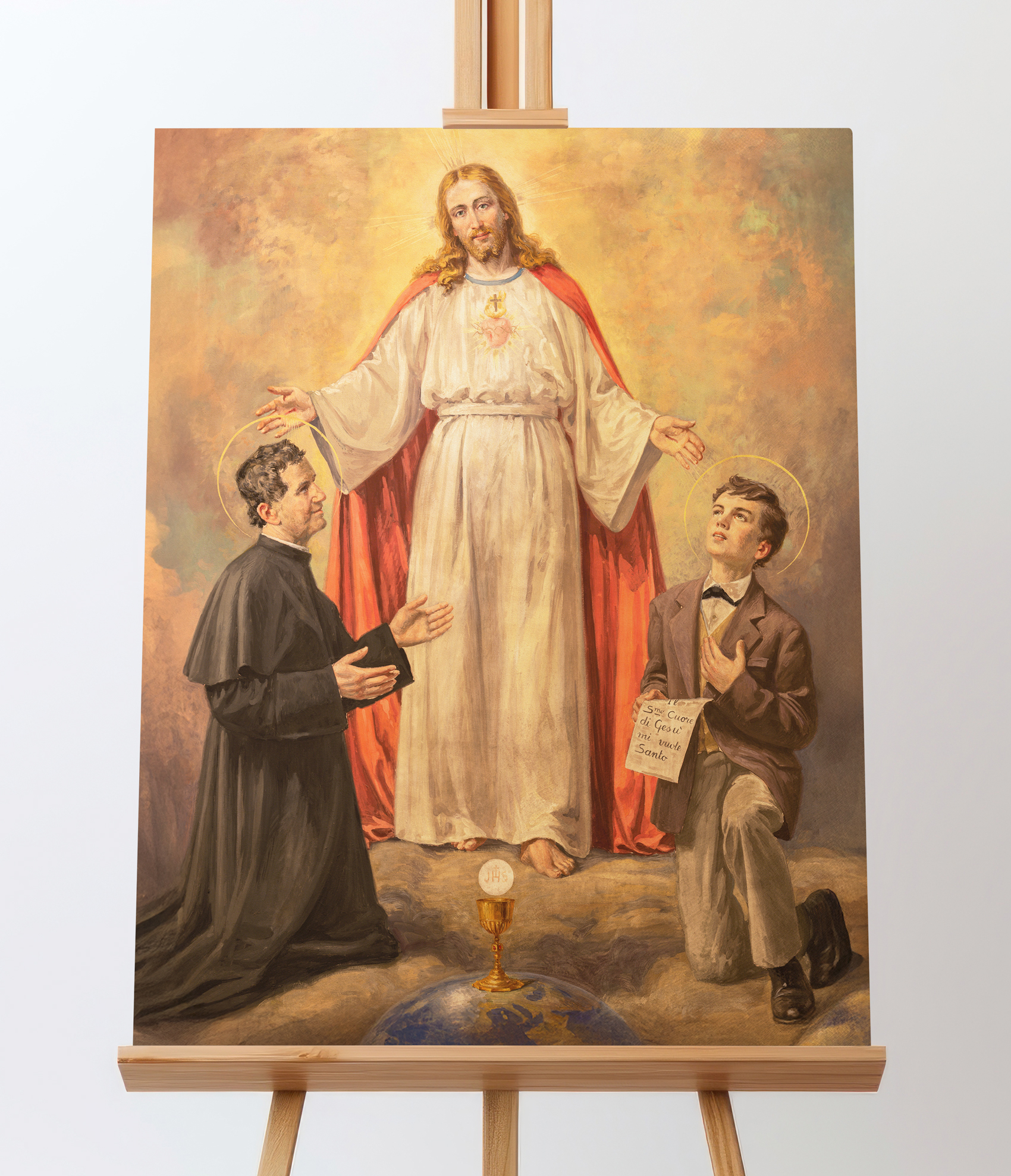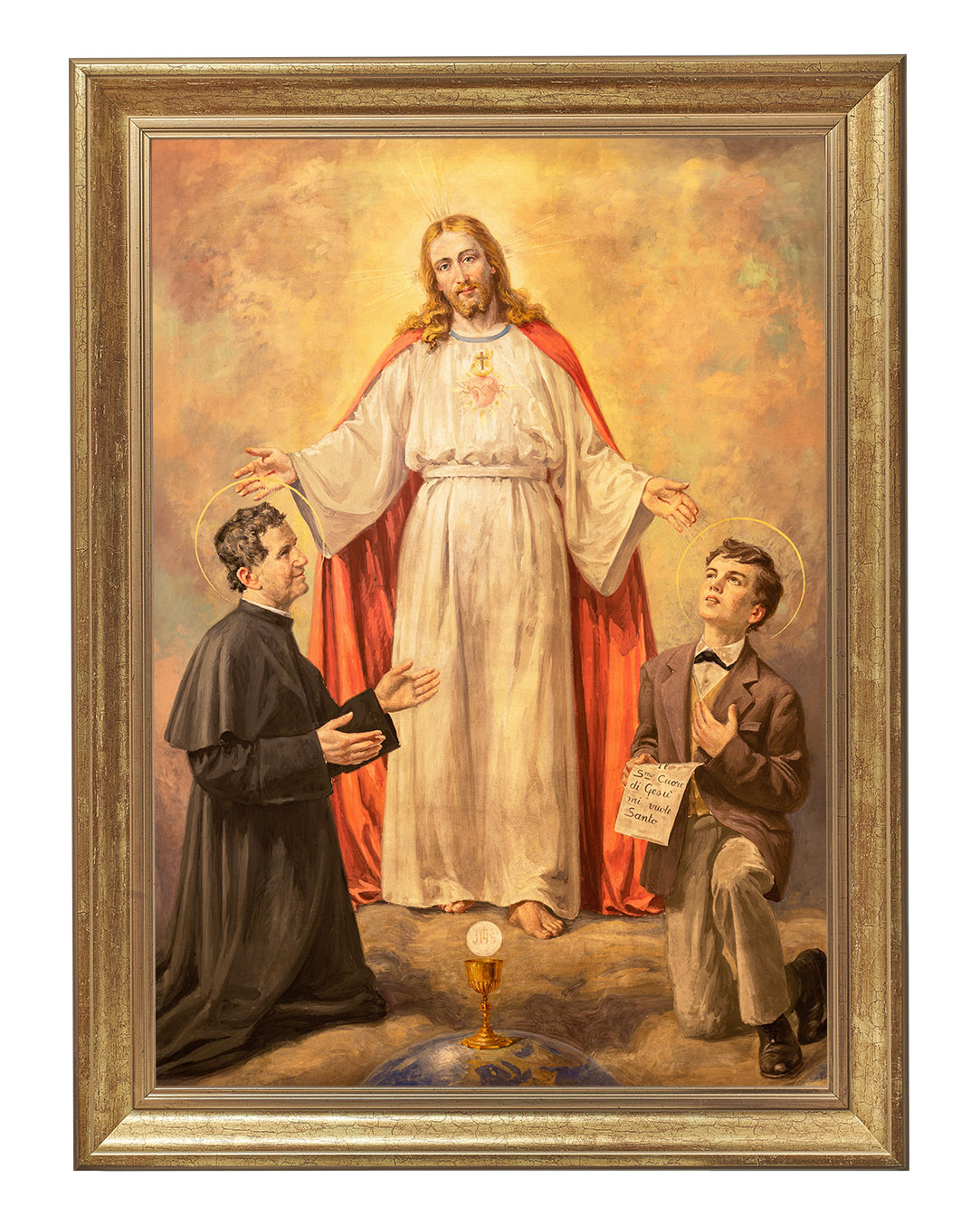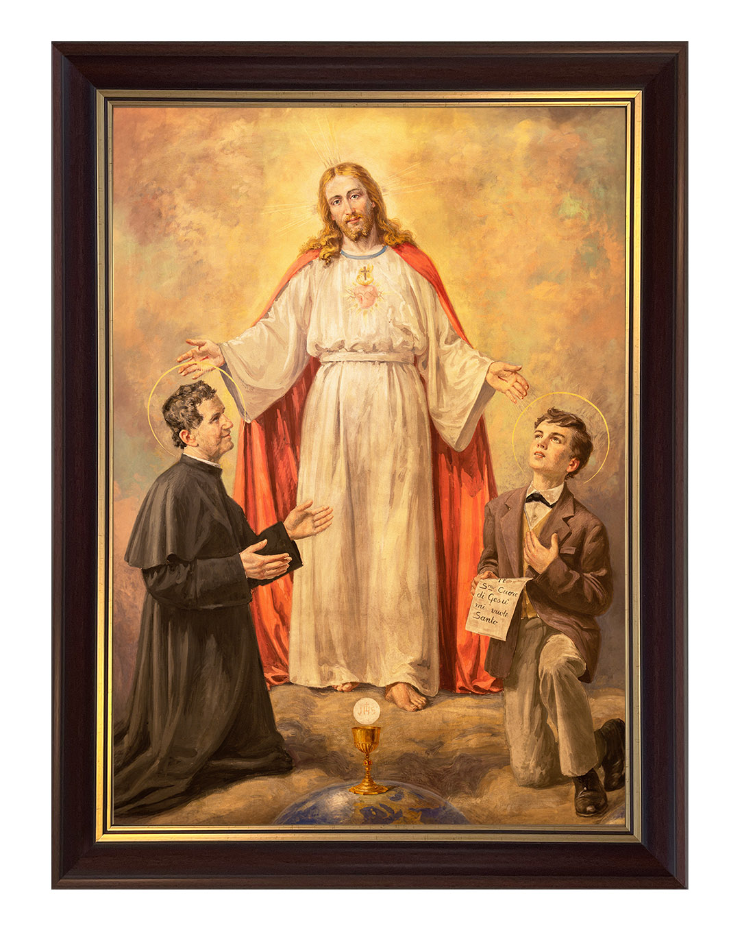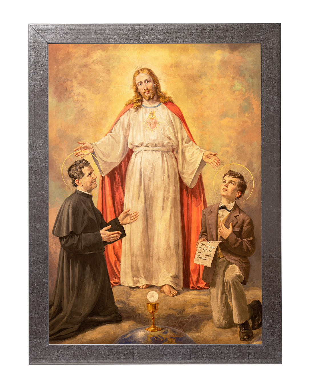 Ten wyjątkowy obraz ukazuje świętego Jana Bosko i jego duchowego syna, świętego Dominika Savio, w mistycznej wizji Chrystusa. Centralną postacią dzieła jest Jezus Chrystus, ubrany w białą szatę z czerwonym płaszczem, symbolizującym Jego miłość i poświęcenie. Jego rozpostarte ramiona zdają się obejmować i błogosławić dwóch klęczących świętych.Po lewej stronie znajduje się św. Jan Bosko, włoski kapłan i założyciel Zgromadzenia Salezjanów, znany ze swojej pracy wychowawczej wśród młodzieży. Jego pełne oddania spojrzenie oraz gest skierowany w stronę Chrystusa wyrażają pokorę i głęboką wiarę.