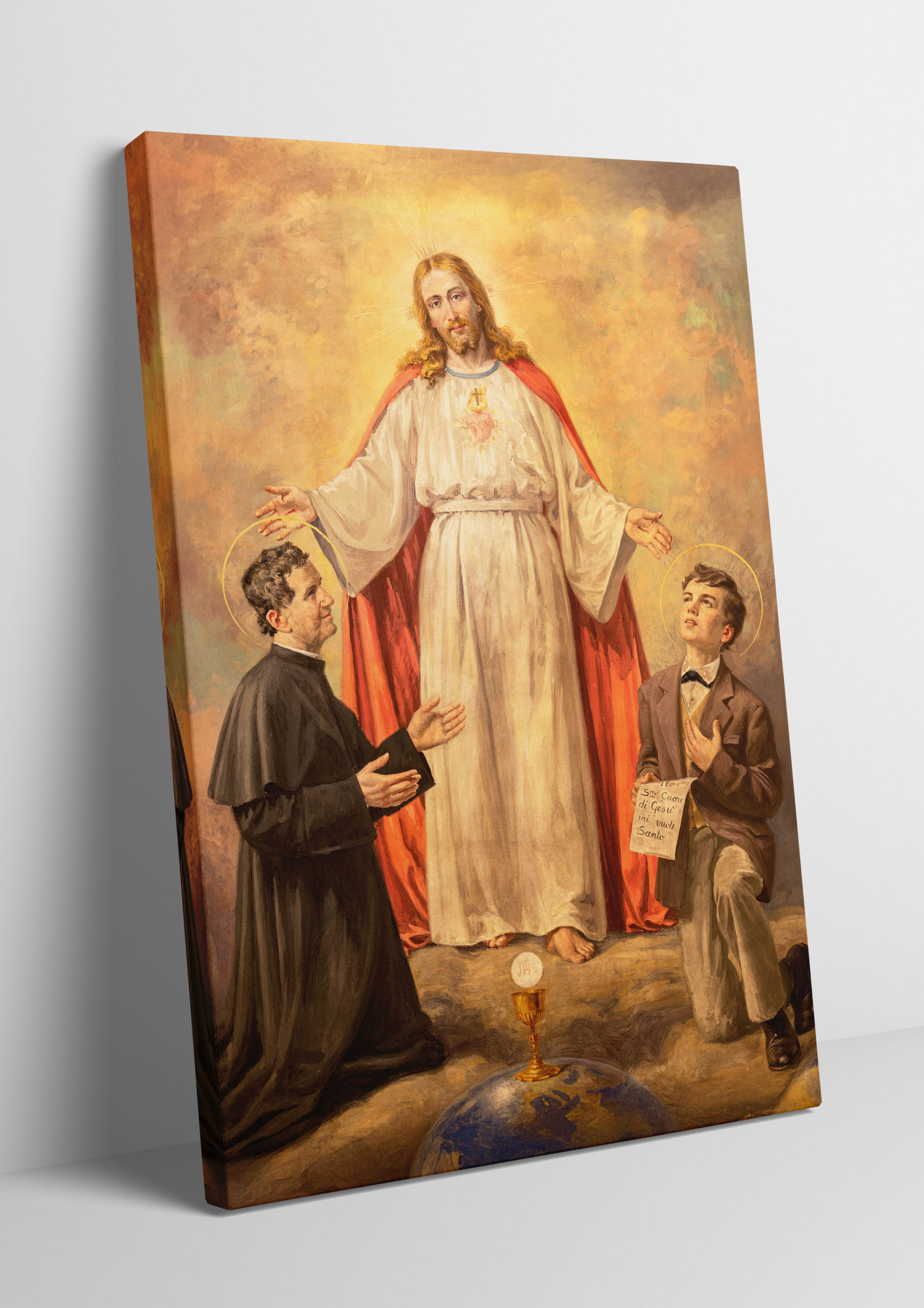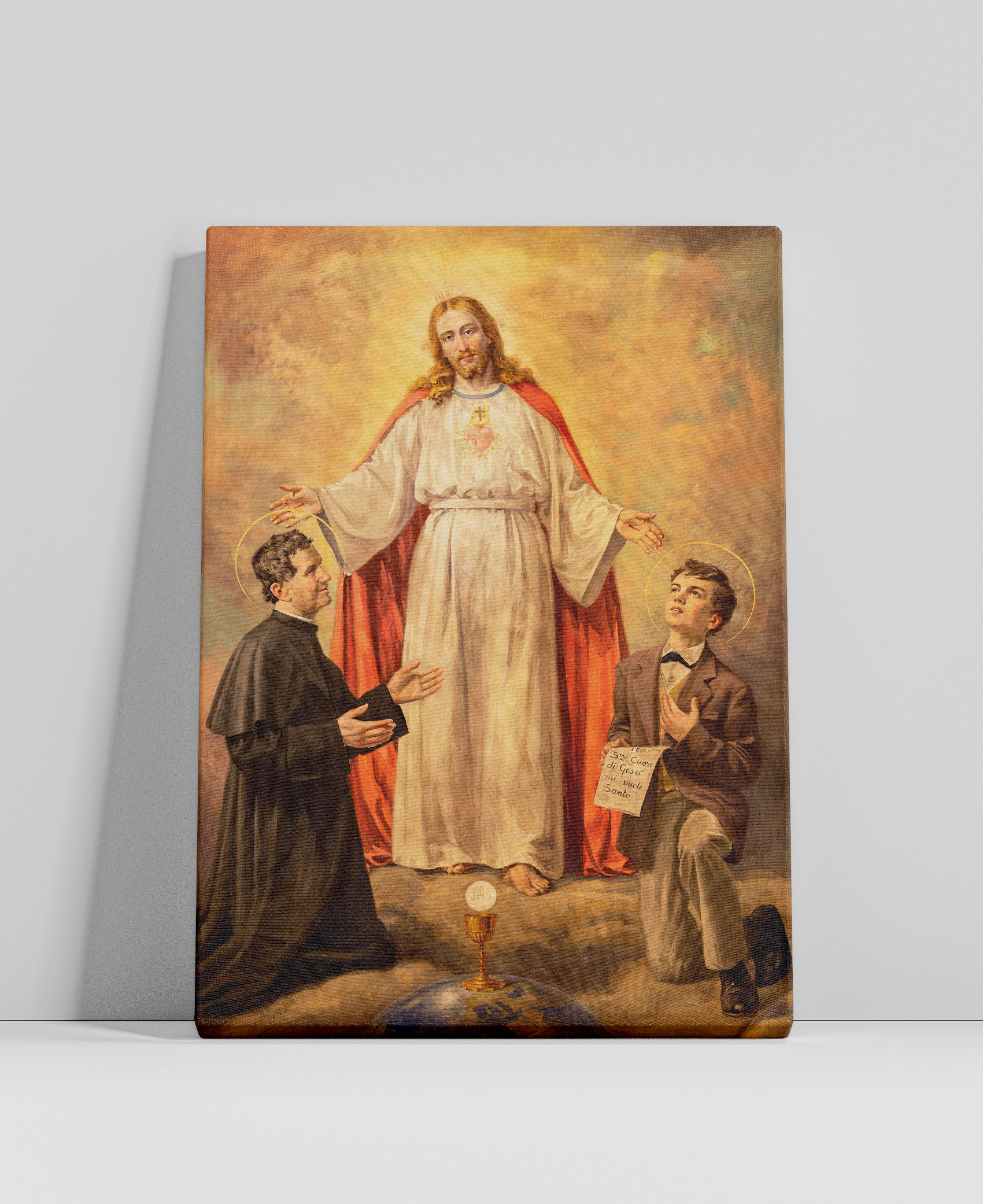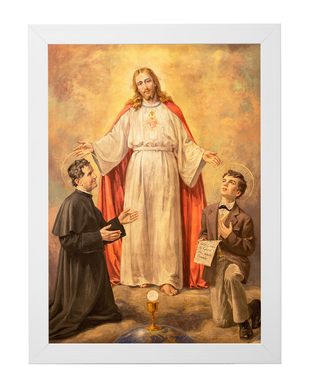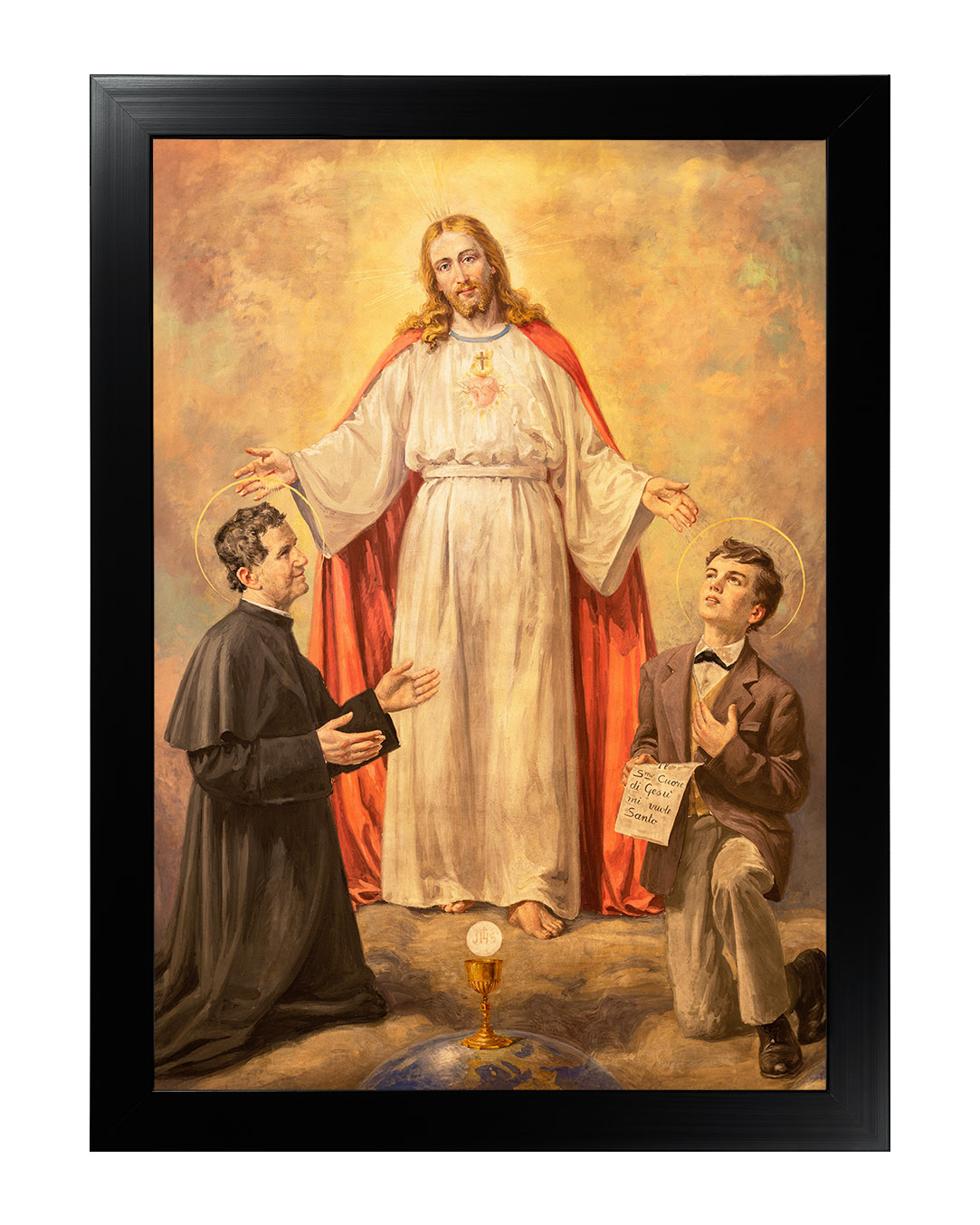 Ten wyjątkowy obraz ukazuje świętego Jana Bosko i jego duchowego syna, świętego Dominika Savio, w mistycznej wizji Chrystusa. Centralną postacią dzieła jest Jezus Chrystus, ubrany w białą szatę z czerwonym płaszczem, symbolizującym Jego miłość i poświęcenie. Jego rozpostarte ramiona zdają się obejmować i błogosławić dwóch klęczących świętych.Po lewej stronie znajduje się św. Jan Bosko, włoski kapłan i założyciel Zgromadzenia Salezjanów, znany ze swojej pracy wychowawczej wśród młodzieży. Jego pełne oddania spojrzenie oraz gest skierowany w stronę Chrystusa wyrażają pokorę i głęboką wiarę.