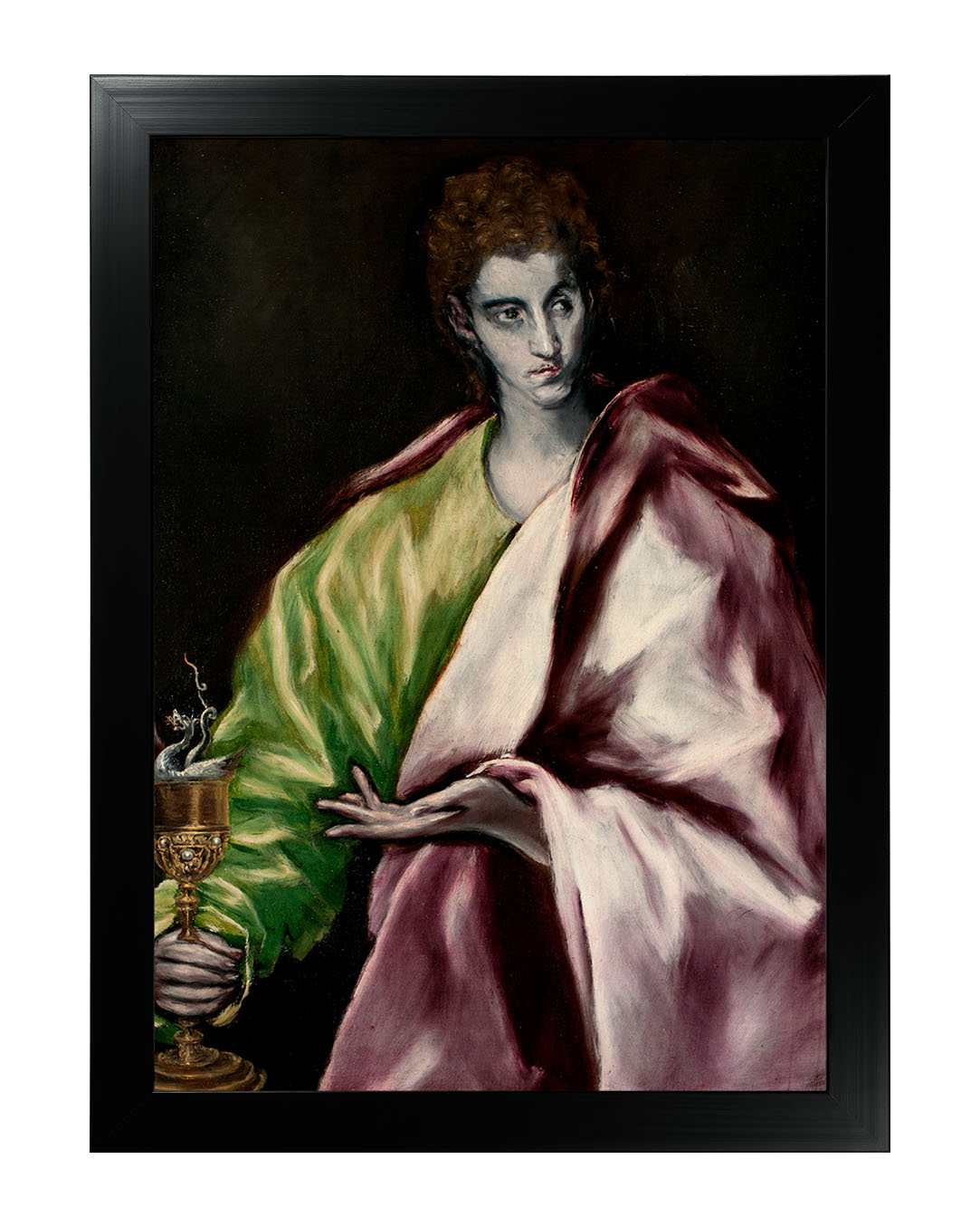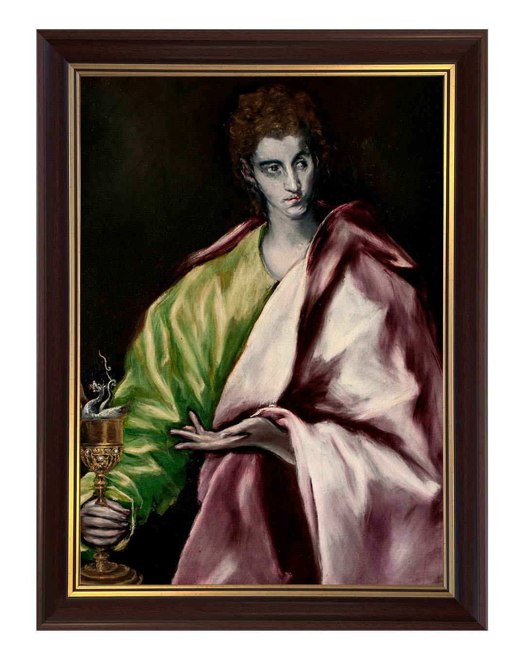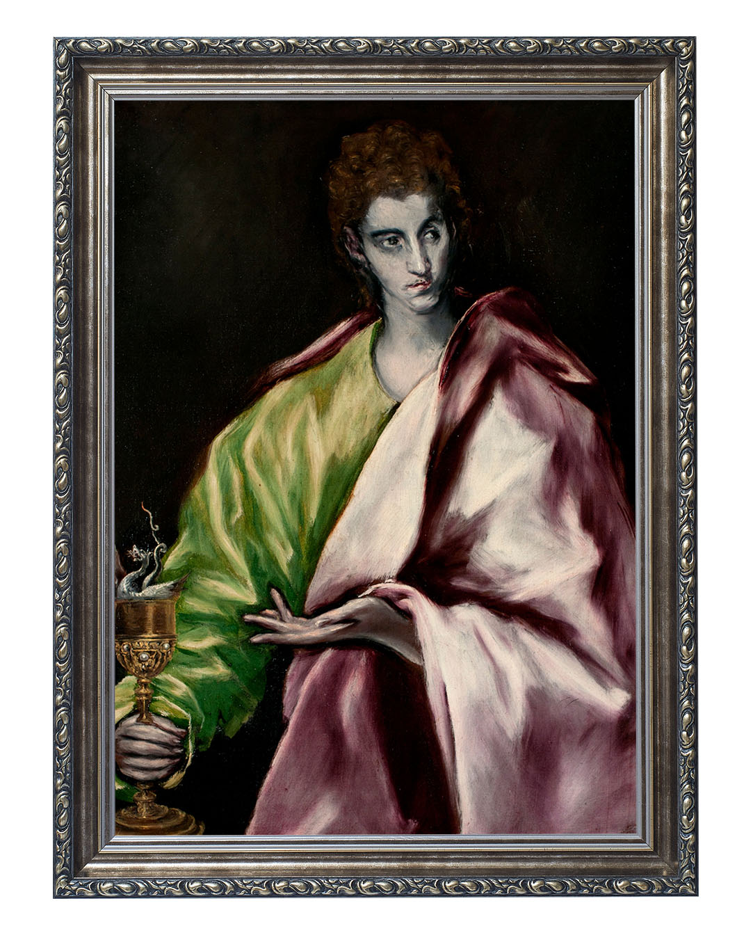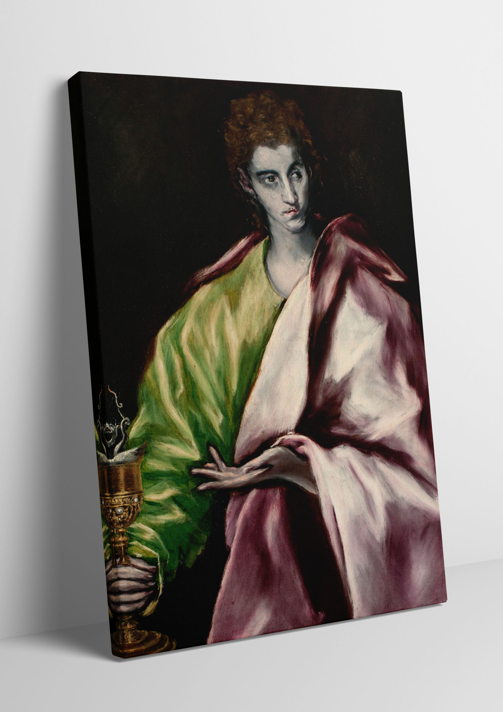Obraz przedstawia św. Jana Apostoła, jednego z najbliższych uczniów Jezusa, często nazywanego „umiłowanym uczniem”. Obraz jest dziełem hiszpańskiego malarza El Greca (Domenikosa Theotokopoulosa). Jan Apostoł został ukazany w charakterystyczny dla sztuki sakralnej sposób – jako młody mężczyzna o delikatnych, niemal androgynicznych rysach twarzy, co podkreśla jego duchową czystość i niewinność. Jego spojrzenie jest pełne zamyślenia, a gesty rąk sugerują zarówno spokój, jak i wewnętrzną refleksję. Ubrany jest w obszerną szatę o intensywnych barwach – zieleni i purpurze, które mogą symbolizować nadzieję oraz królewską godność. W lewej ręce trzyma złoty kielich, z którego wyłania się wąż, nawiązując do legendy, według której św. Jan miał zostać otruty zatrutym winem, ale dzięki boskiej interwencji trucizna zamieniła się w węża. To symbol jego niezłomnej wiary oraz ochrony przez Boga.Patron