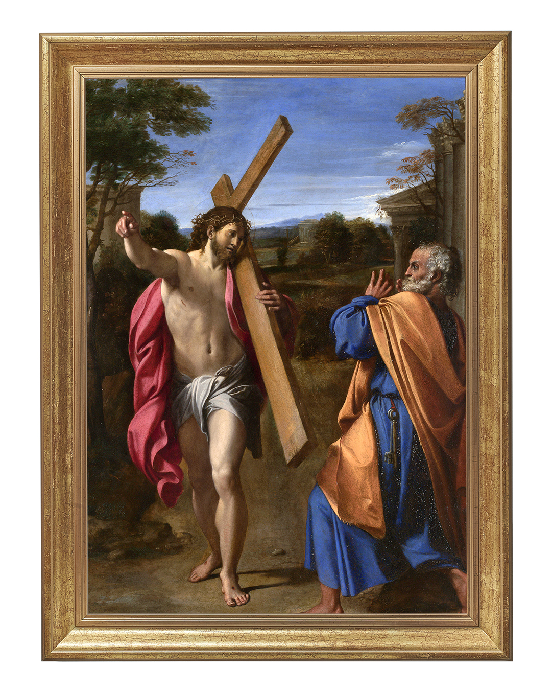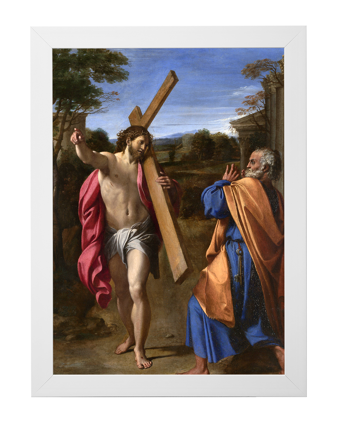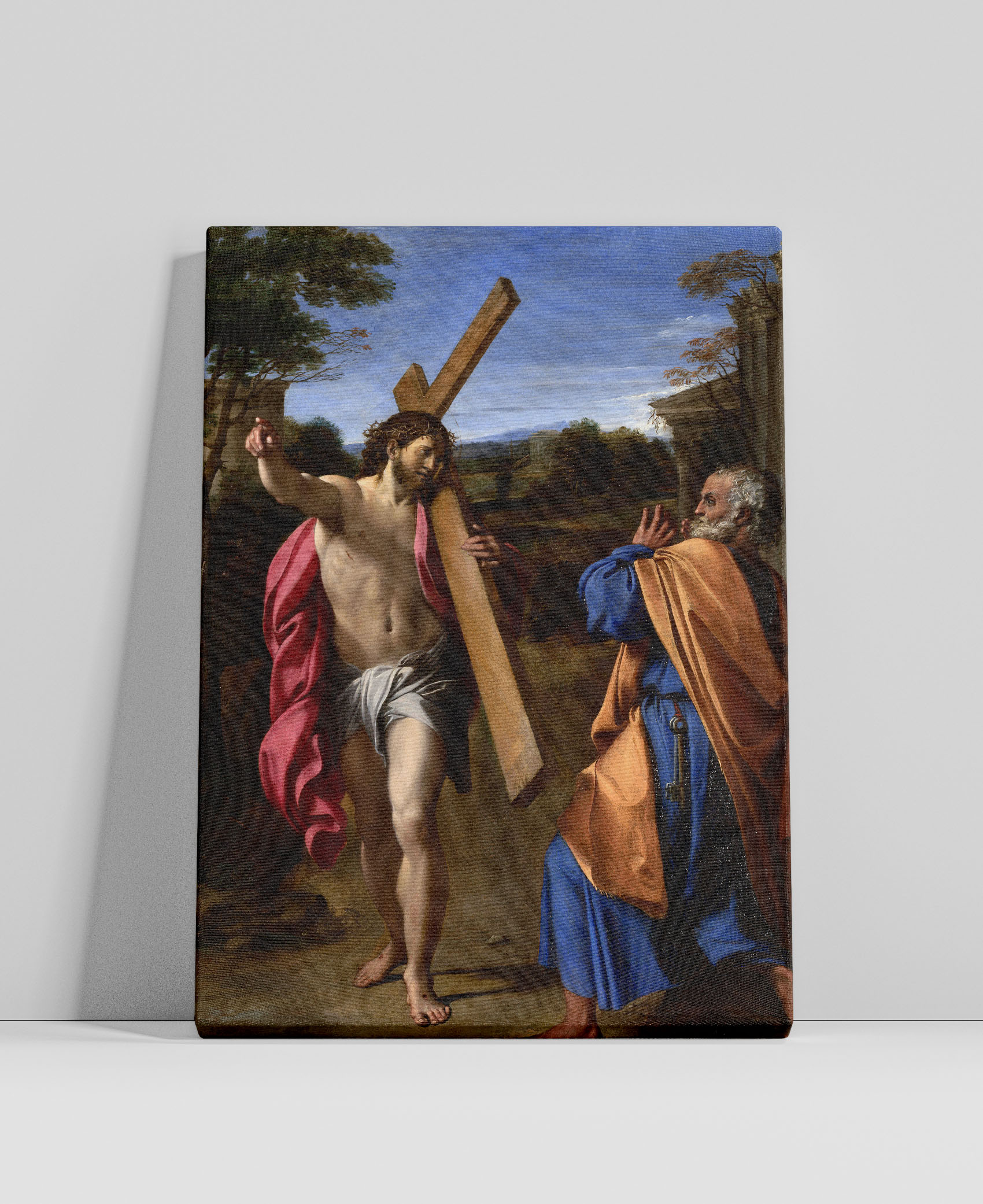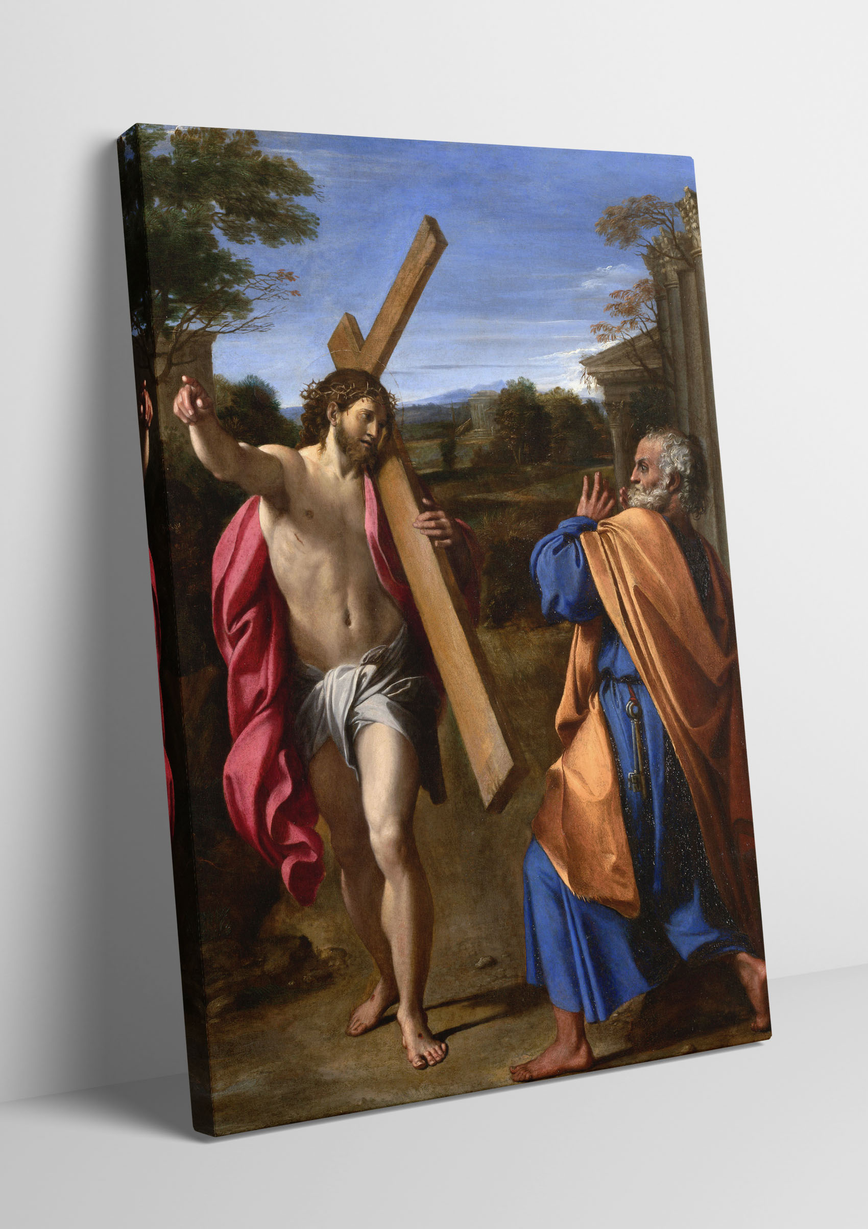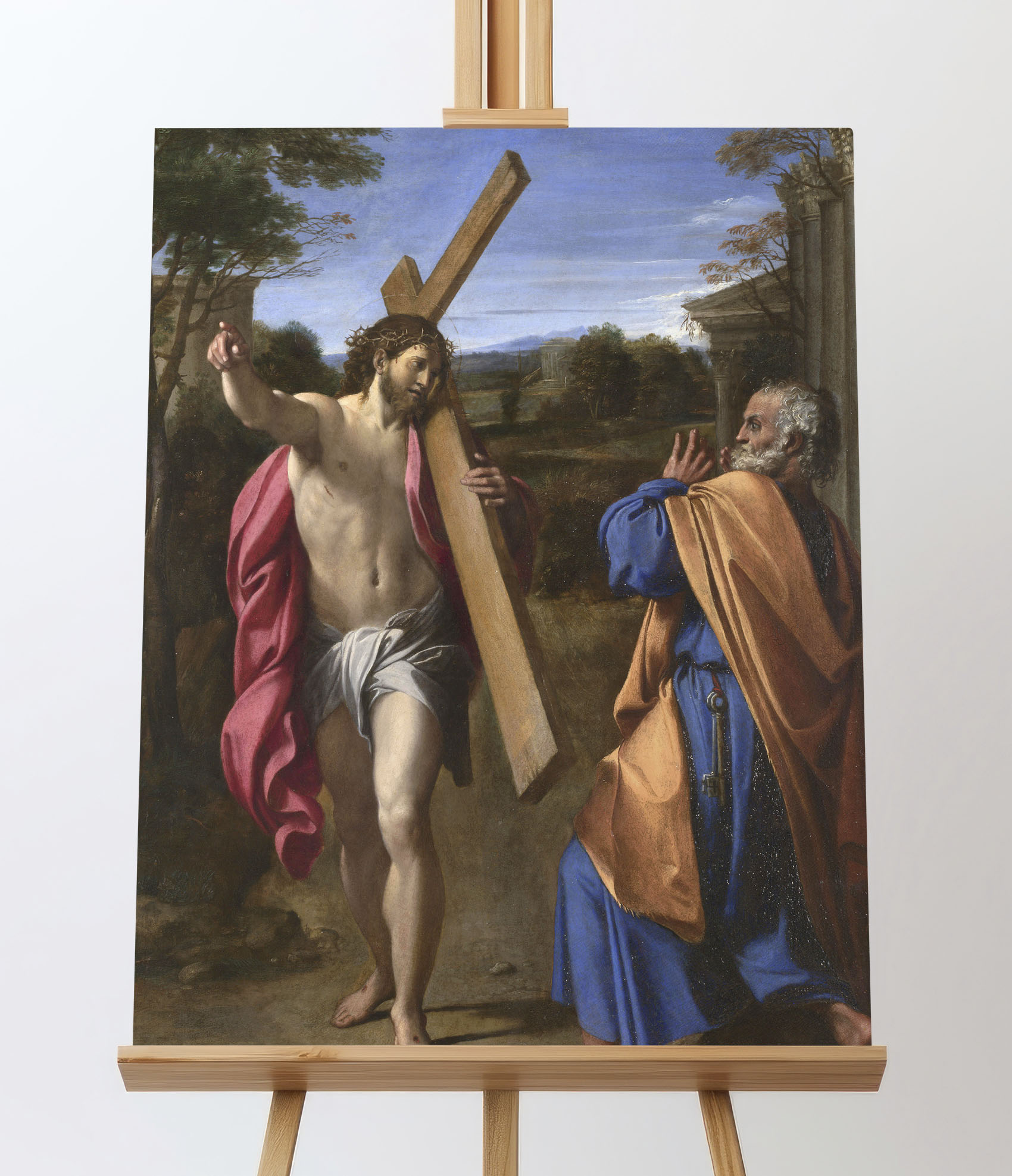 Obraz przedstawia św. Szymona Piotra, jednego z dwunastu apostołów Jezusa i pierwszego papieża Kościoła katolickiego. Obraz Chrystus ukazuje się Świętemu Piotrowi na Via Appia autorstwa Annibale'a Carracciego przedstawia moment, kiedy Święty Piotr, uciekający z Rzymu w obawie przed śmiercią, spotyka Chrystusa na drodze. Chrystus mówi mu, że idzie do Rzymu, by zostać ponownie ukrzyżowanym, co prowadzi Piotra do powrotu, by stanąć w obliczu własnej męczeńskiej śmierci. Obraz wyróżnia się dramatycznym układem postaci i intensywnym światłem, typowym dla późnego stylu Carracciego.