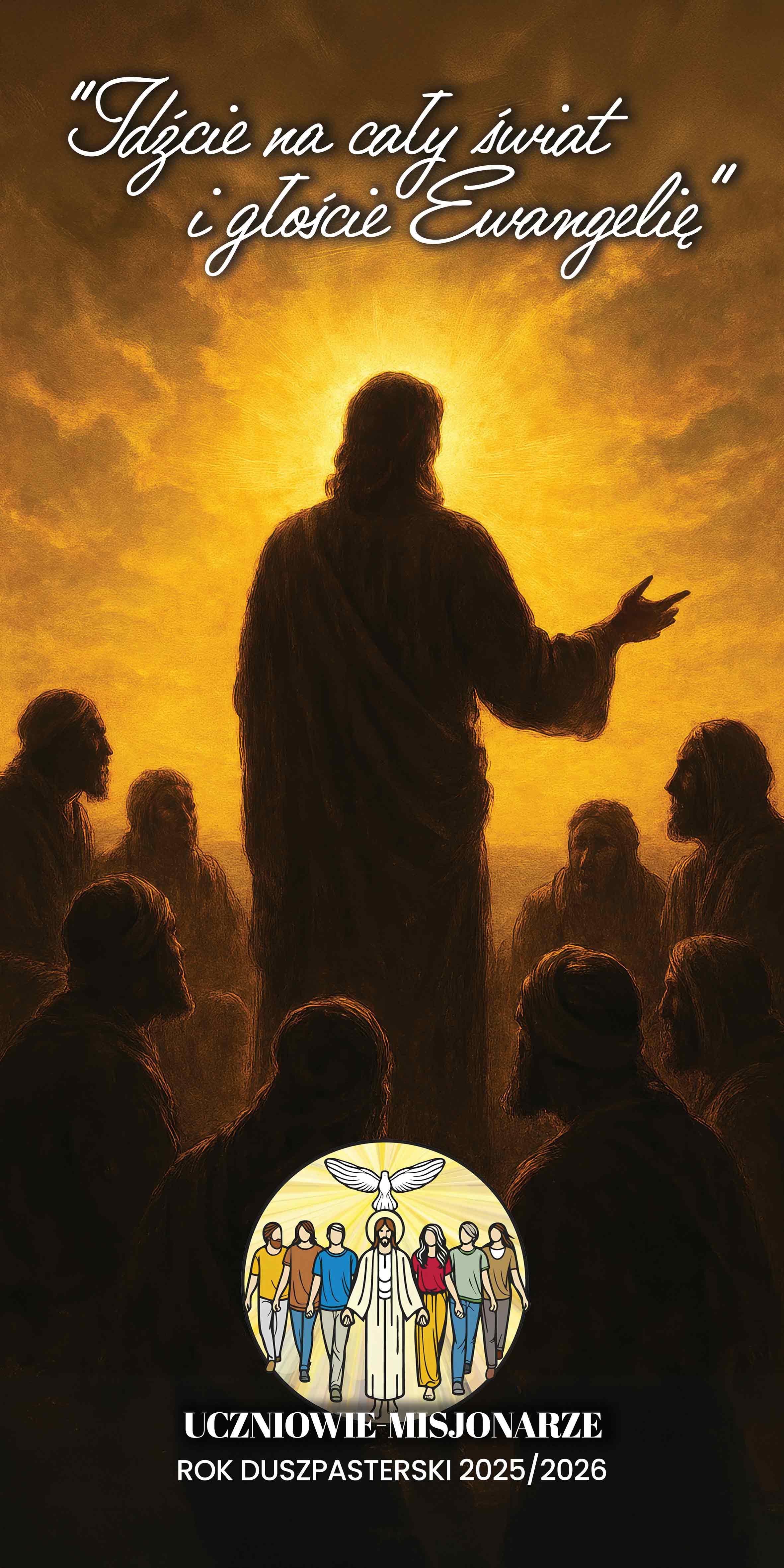 Centralną postacią jest Jezus ukazany w złocistej aureolii światła, która symbolizuje łaskę i prawdę. Jego spokojny gest ręki wskazuje na posłanie i odpowiedzialność przekazywaną uczniom. Otaczająca Go grupa słuchaczy tworzy klasyczną scenę misyjną – wzór obecny w sztuce chrześcijańskiej od wieków. Logo u dołu, z wizerunkiem Chrystusa prowadzącego ludzi różnych pokoleń, podkreśla współczesny charakter wezwania „Uczniowie-misjonarze”, a gołębica nad nimi jest znakiem działania Ducha Świętego.Duchowe przesłanie