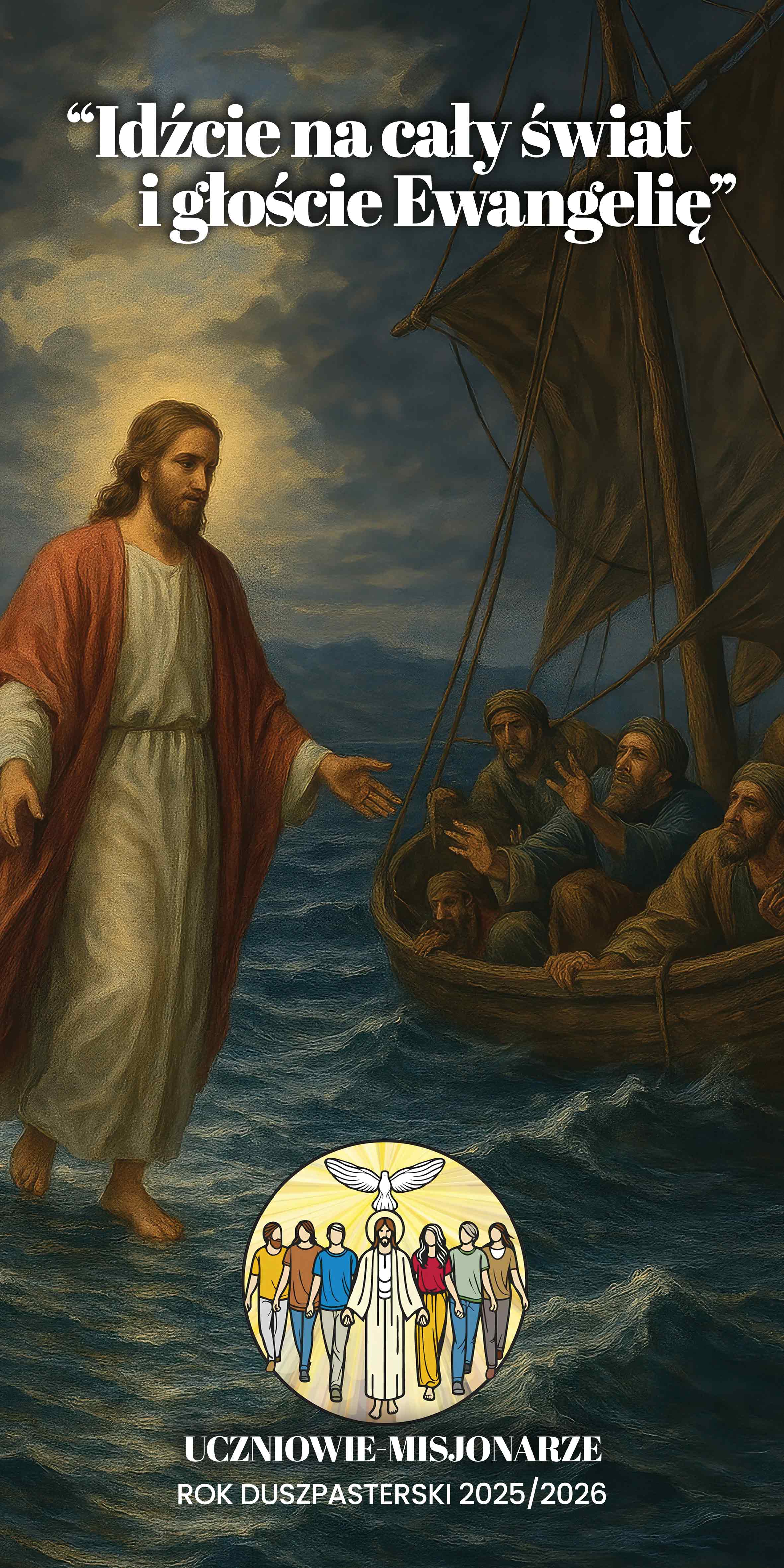 Centralną sceną jest Jezus kroczący po wzburzonej wodzie, zwrócony ku uczniom siedzącym w łodzi. Jego wyciągnięta ręka symbolizuje wezwanie do zaufania i podjęcia drogi, nawet jeśli wydaje się ona trudna. Uczniowie, pochylający się w Jego stronę, ukazują postawę słuchania i gotowość do odpowiedzi. Łódź — tradycyjny znak Kościoła — przypomina o wspólnocie, która trwa dzięki obecności Pana. Ciepła aureola otaczająca Chrystusa podkreśla źródło światła i pokoju. Umieszczone poniżej logo programu „Uczniowie-Misjonarze” akcentuje jedność pokoleń i dar Ducha Świętego, który prowadzi wierzących.