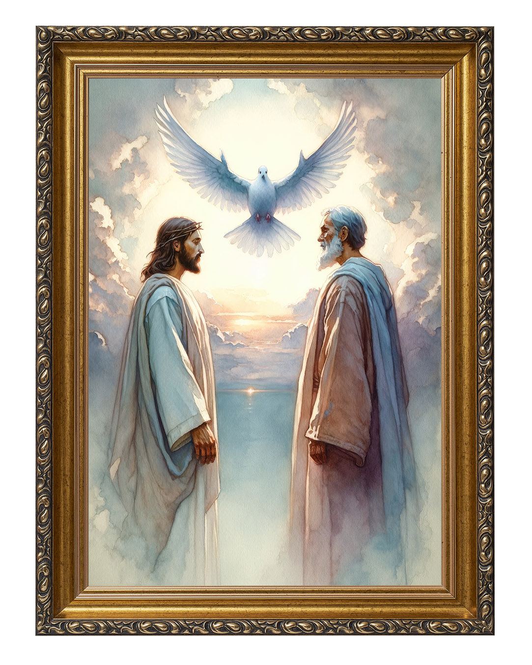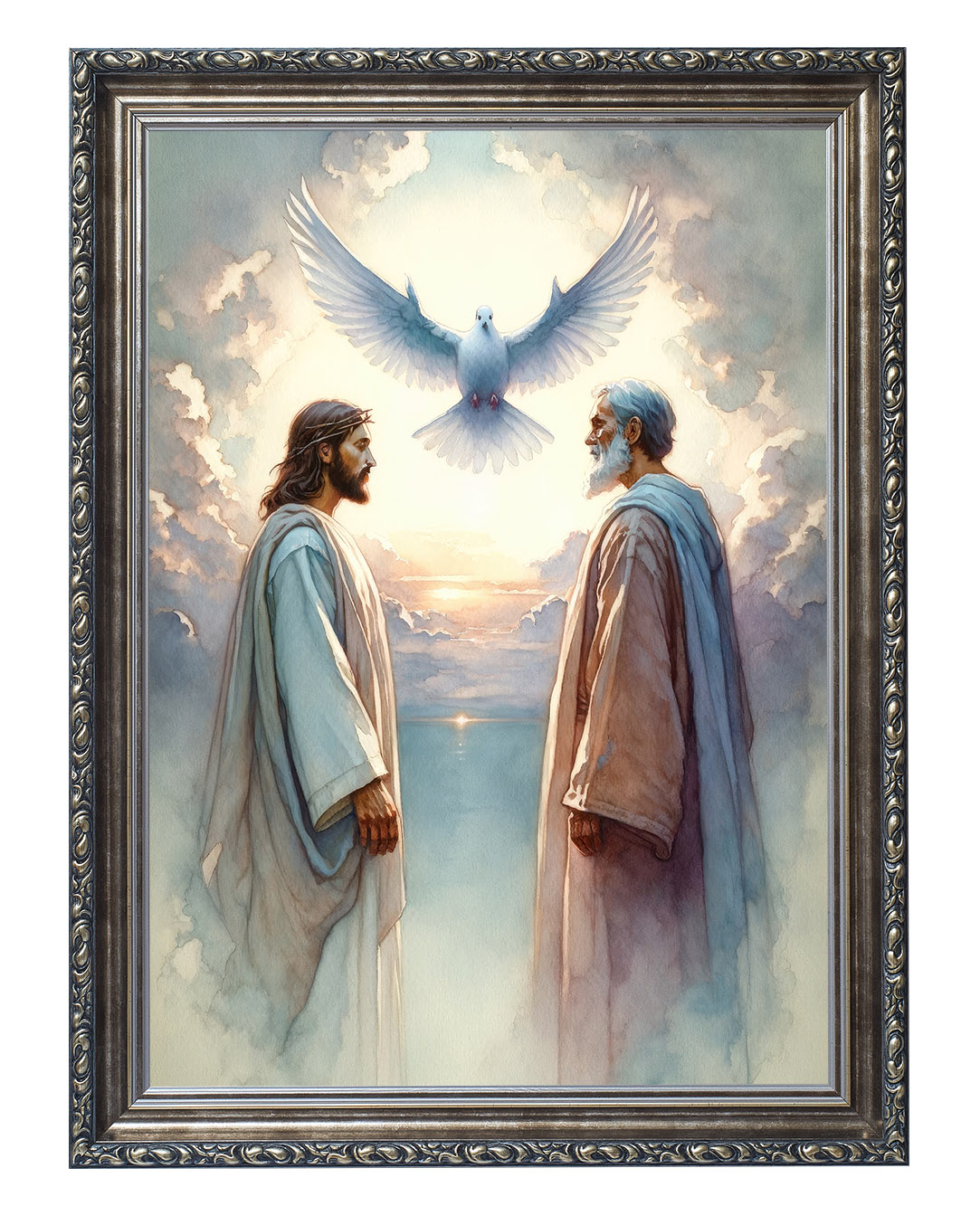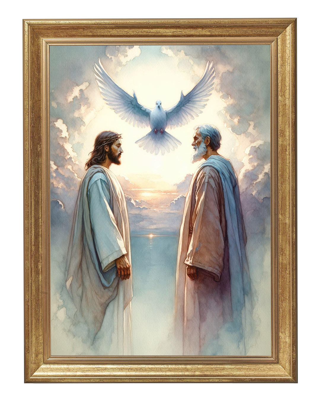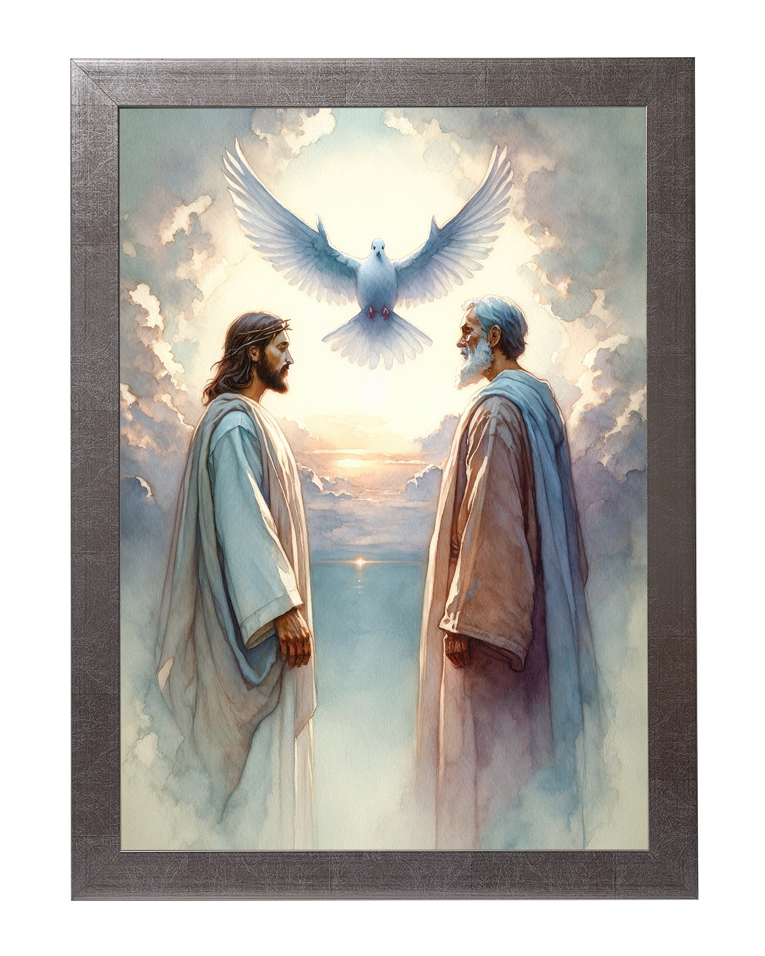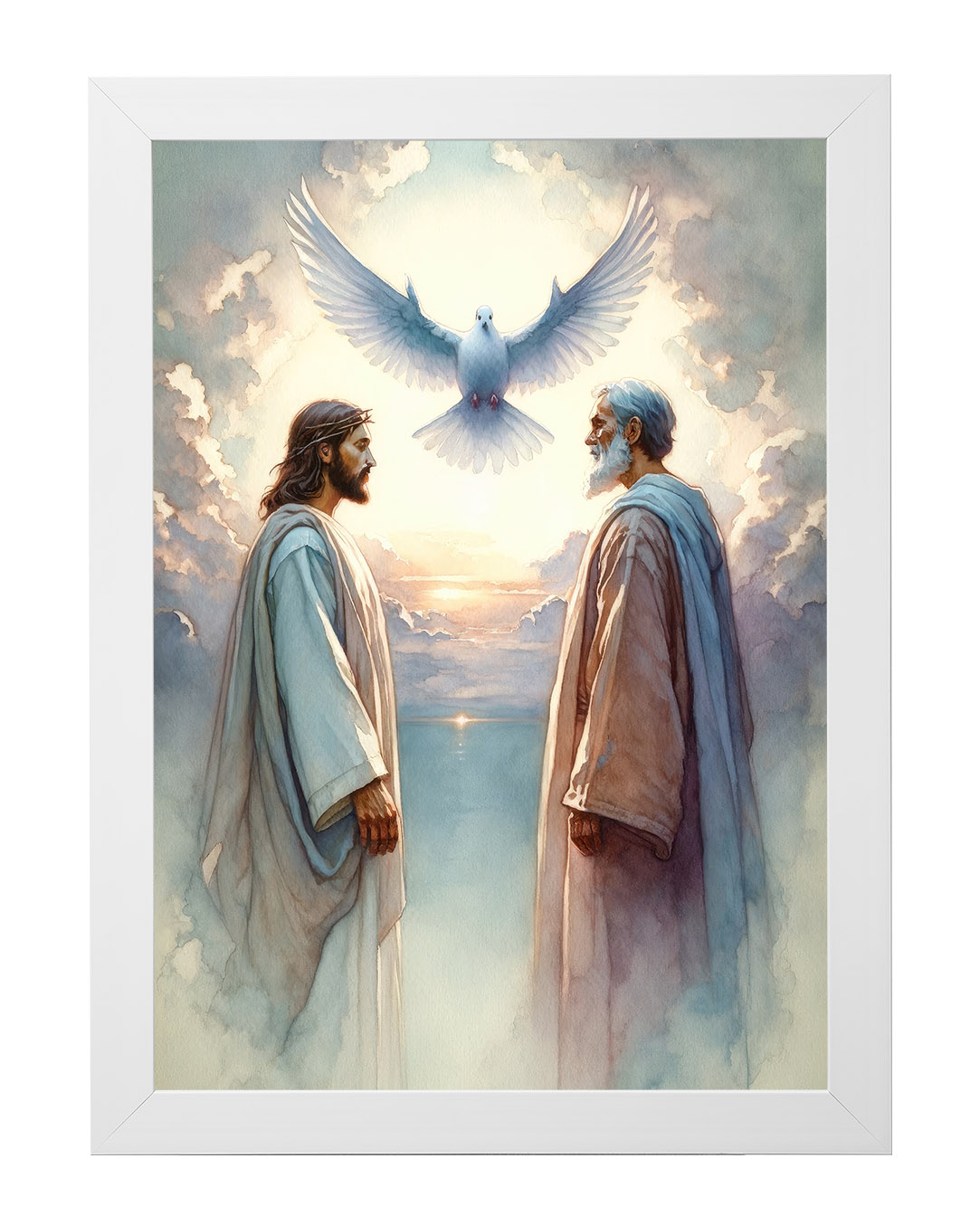 Miękka, malarska faktura i pastelowa kolorystyka nadają obrazowi lekkość i głębię. Kompozycja oparta na osi pionowej, z gołębicą w górnej partii, prowadzi wzrok ku górze, wzmacniając wrażenie transcendencji. Całość sprawia wrażenie sceny zanurzonej w świetle i ciszy.