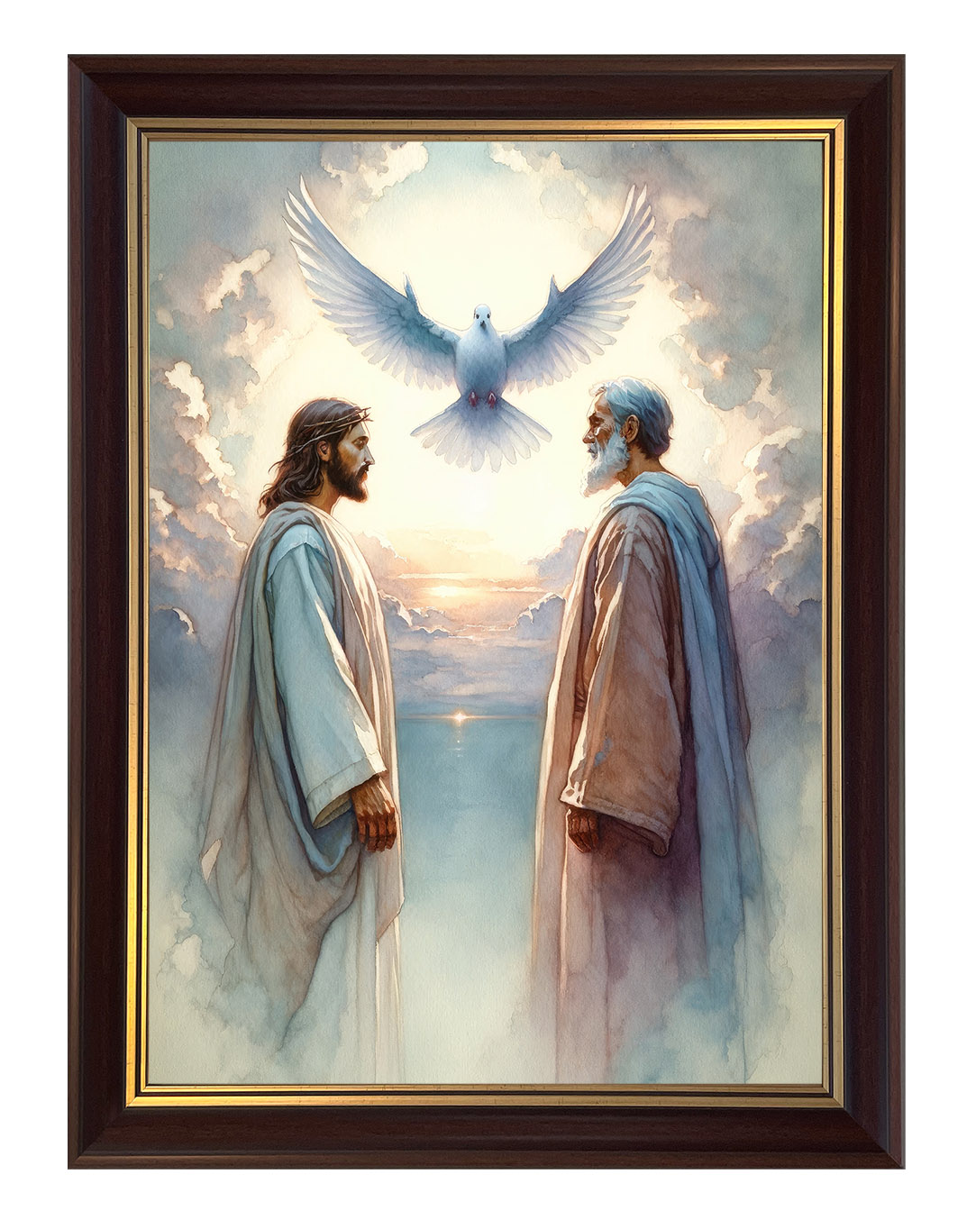 Postacie Ojca i Syna stoją naprzeciw siebie, w spokojnej, niemal lustrzanej postawie, co podkreśla jedność natury przy zachowaniu odrębności Osób. Ich szaty utrzymane są w jasnych, stonowanych barwach, harmonizujących z rozświetlonym tłem nieba. Nad nimi unosi się Duch Święty jako gołębica o rozpostartych skrzydłach – znak obecności, pokoju i Boskiego tchnienia. Światło wypływające z centrum obrazu nie ma jednego źródła, lecz zdaje się obejmować całą scenę, wskazując na wspólne istnienie i działanie Trójcy.
