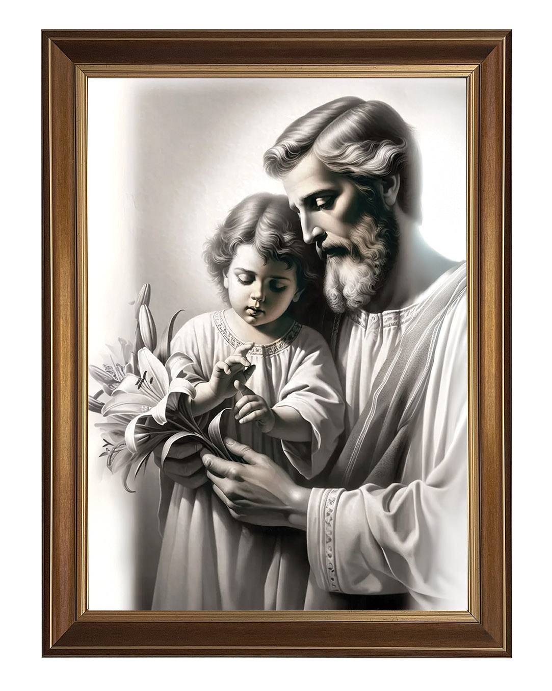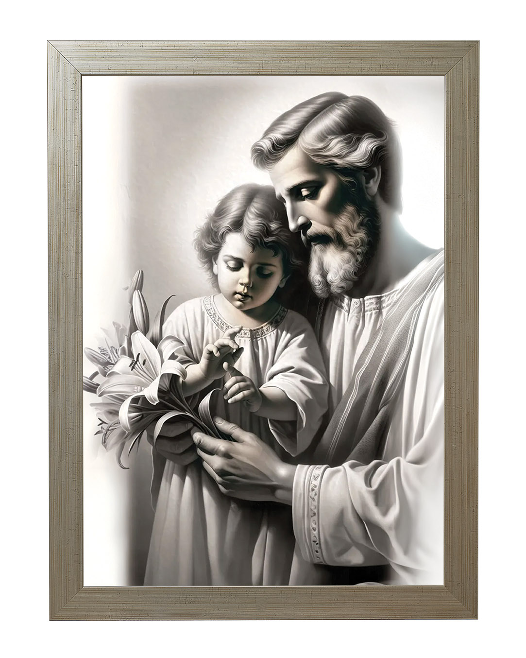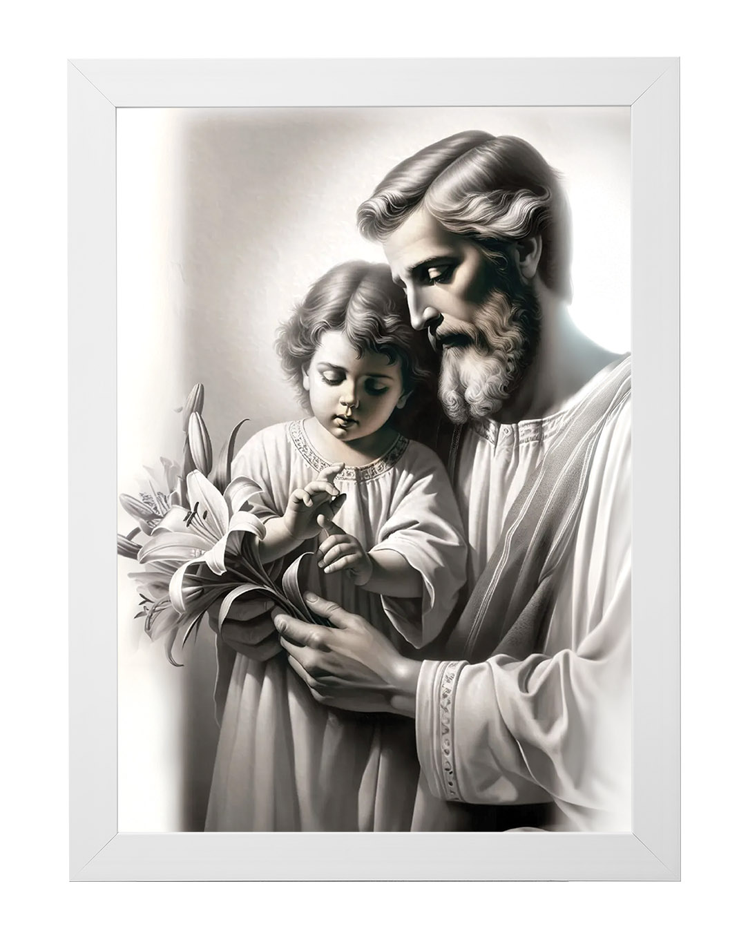 Postać Świętego Józefa została ukazana jako dojrzały mężczyzna o łagodnych rysach twarzy i siwej brodzie, co podkreśla jego rolę opiekuna i strażnika Świętej Rodziny. W dłoniach trzyma białe lilie – tradycyjny atrybut Józefa, czytelny znak czystości serca i wierności powierzonemu zadaniu. Dzieciątko Jezus, ubrane w prostą szatę, z uwagą dotyka kwiatu, co tworzy subtelną relację między gestem dziecka a spokojnym prowadzeniem dłoni przez Józefa. Jasna kolorystyka i miękkie światło wzmacniają wrażenie ciszy oraz harmonii.