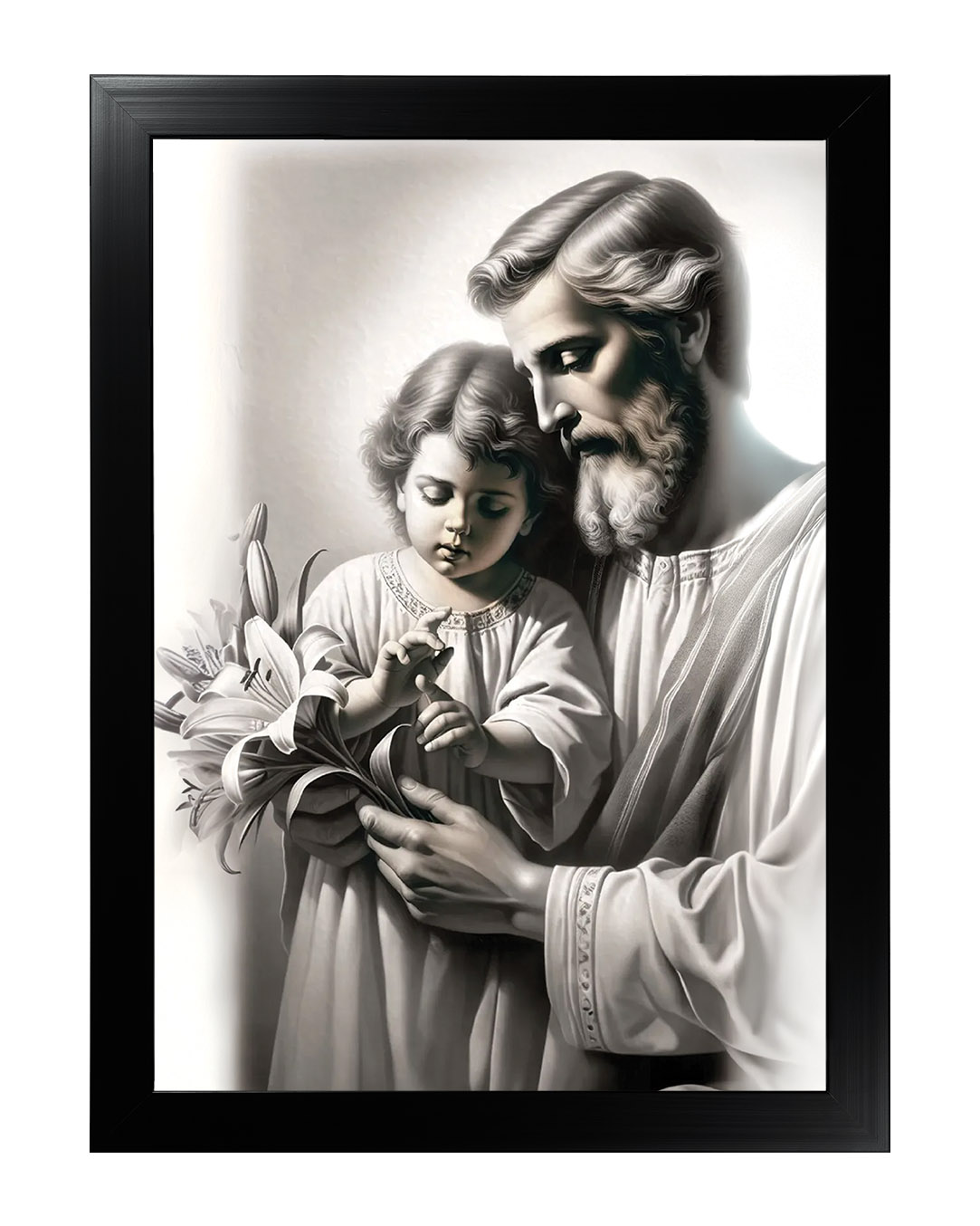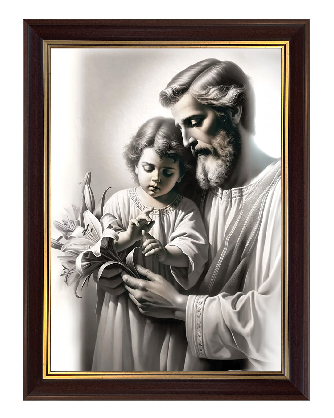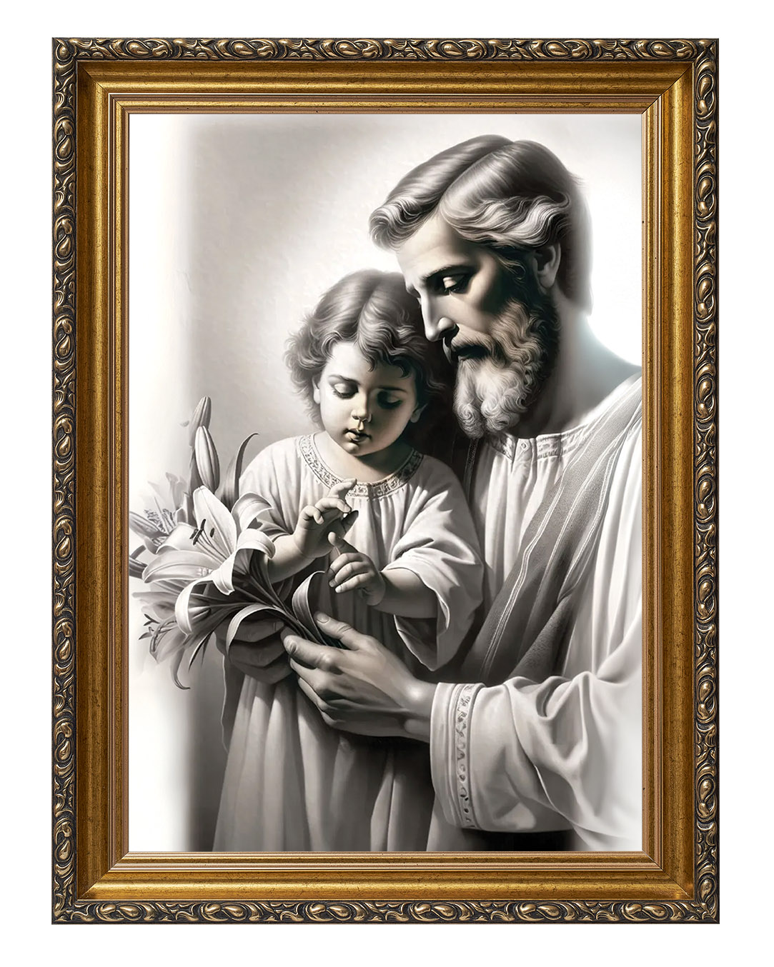 Postać Świętego Józefa została ukazana jako dojrzały mężczyzna o łagodnych rysach twarzy i siwej brodzie, co podkreśla jego rolę opiekuna i strażnika Świętej Rodziny. W dłoniach trzyma białe lilie – tradycyjny atrybut Józefa, czytelny znak czystości serca i wierności powierzonemu zadaniu. Dzieciątko Jezus, ubrane w prostą szatę, z uwagą dotyka kwiatu, co tworzy subtelną relację między gestem dziecka a spokojnym prowadzeniem dłoni przez Józefa. Jasna kolorystyka i miękkie światło wzmacniają wrażenie ciszy oraz harmonii.